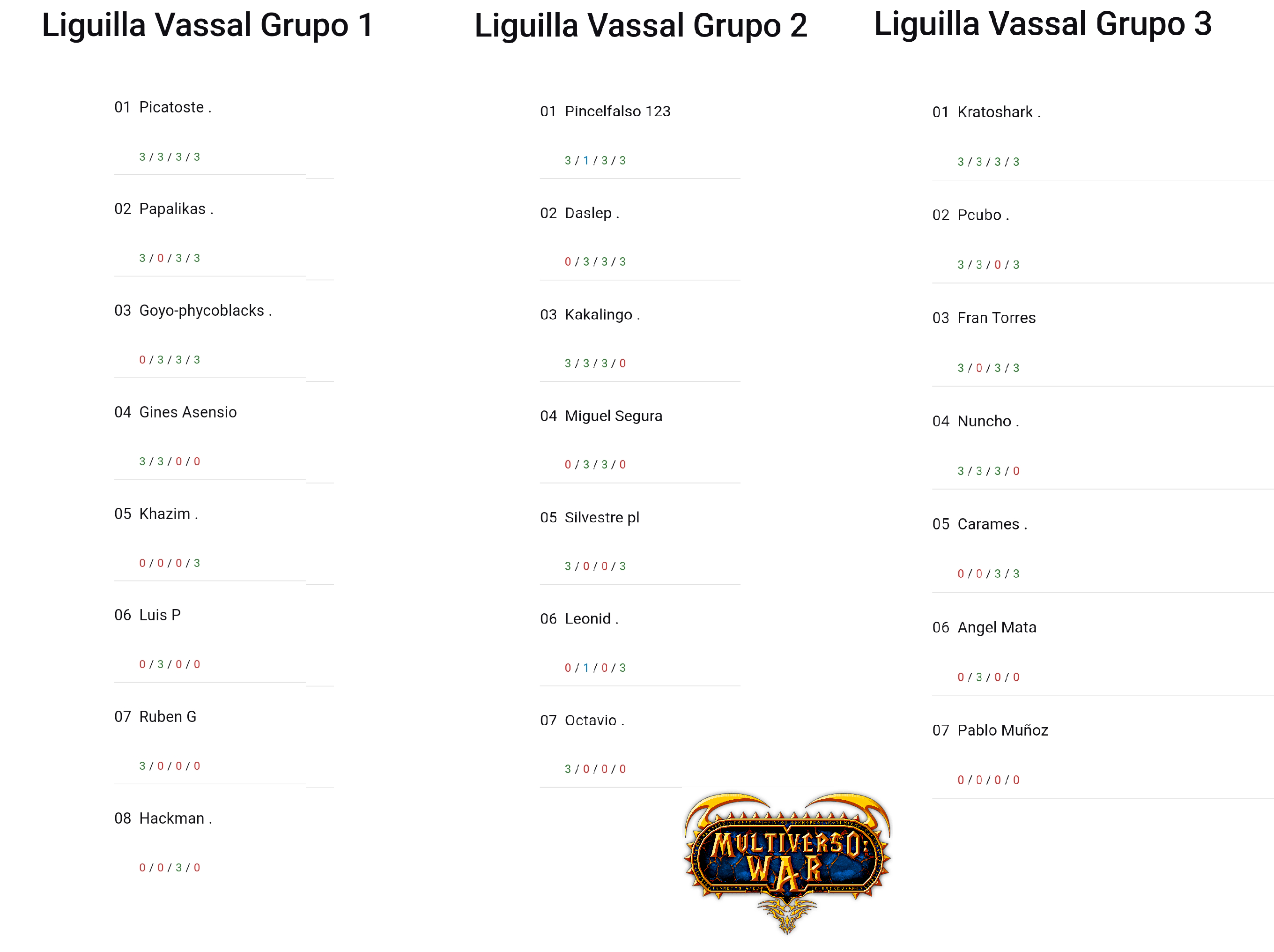 Todavía con la cabeza en los mundiales de Warhammer (donde nuestro compañero Silver nos ha representado a todos los españoles de Underworlds de manera sobresaliente) os traemos el seguimiento semanal de la II Liga de Vassal de Underworlds (formato championship y patrocinada por Multiverso Warhammer) que estamos disfrutando de lo lindo. Vamos a empezar por la clasificación actual de cada grupo.