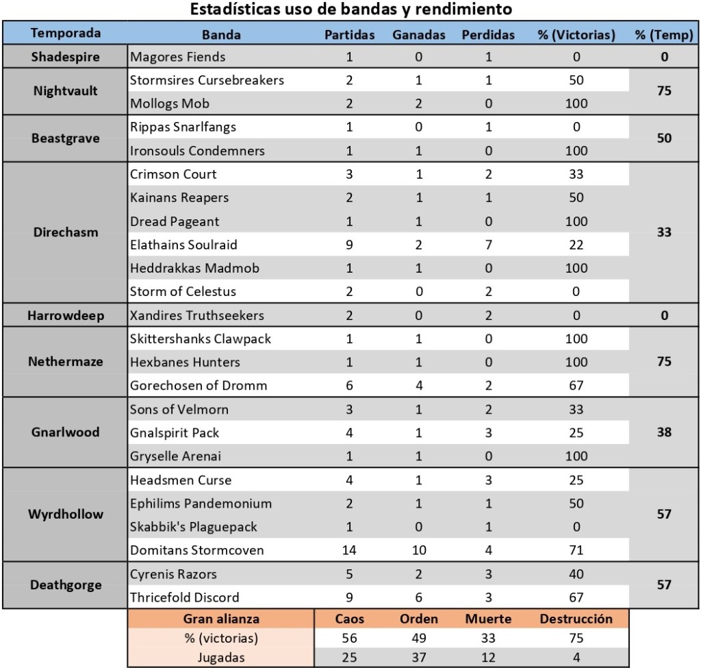 En cuanto a las estadísticas de gran alianza, podemos observar que a la gente le encanta jugar caos y orden. También es verdad que tienen más bandas que ninguna otra gran alianza. Por el otro lado, la alianza de la muerte no está en sus mejores momentos de popularidad y resultados. A destrucción le pasa que se juega poco, aunque cuando lo hacen suelen ganar. ¿Te da esto alguna idea para tus próximas partidas? seguro que sí jeje.