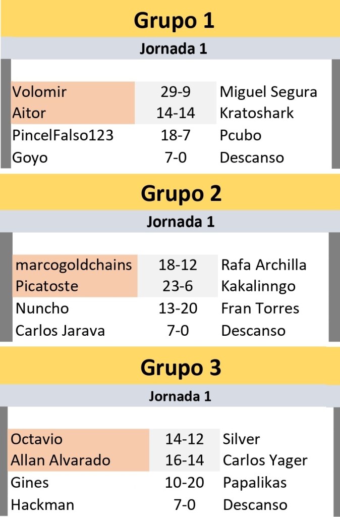 Toda la información de la liga la tenéis en la página del blog dedicada a ella, lo que incluye el sorteo de grupos, el calendario de la liga o las normas. Esta primera jornada tuvo enfrentamientos muy interesantes, entre viejos conocidos de la liga anterior o miembros del mismo equipo (como Pcubo vs PincelFalso).