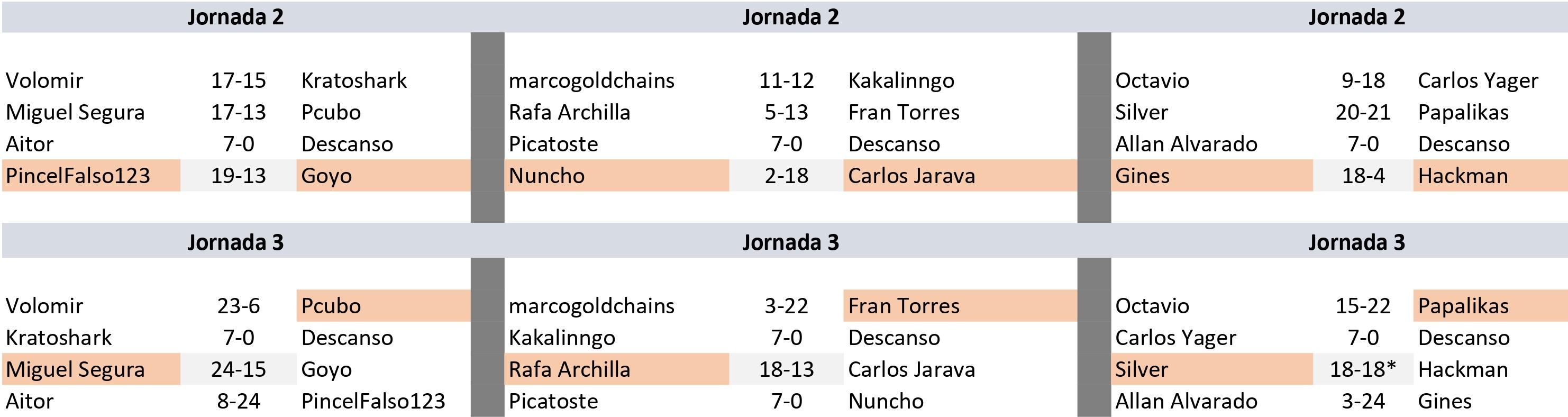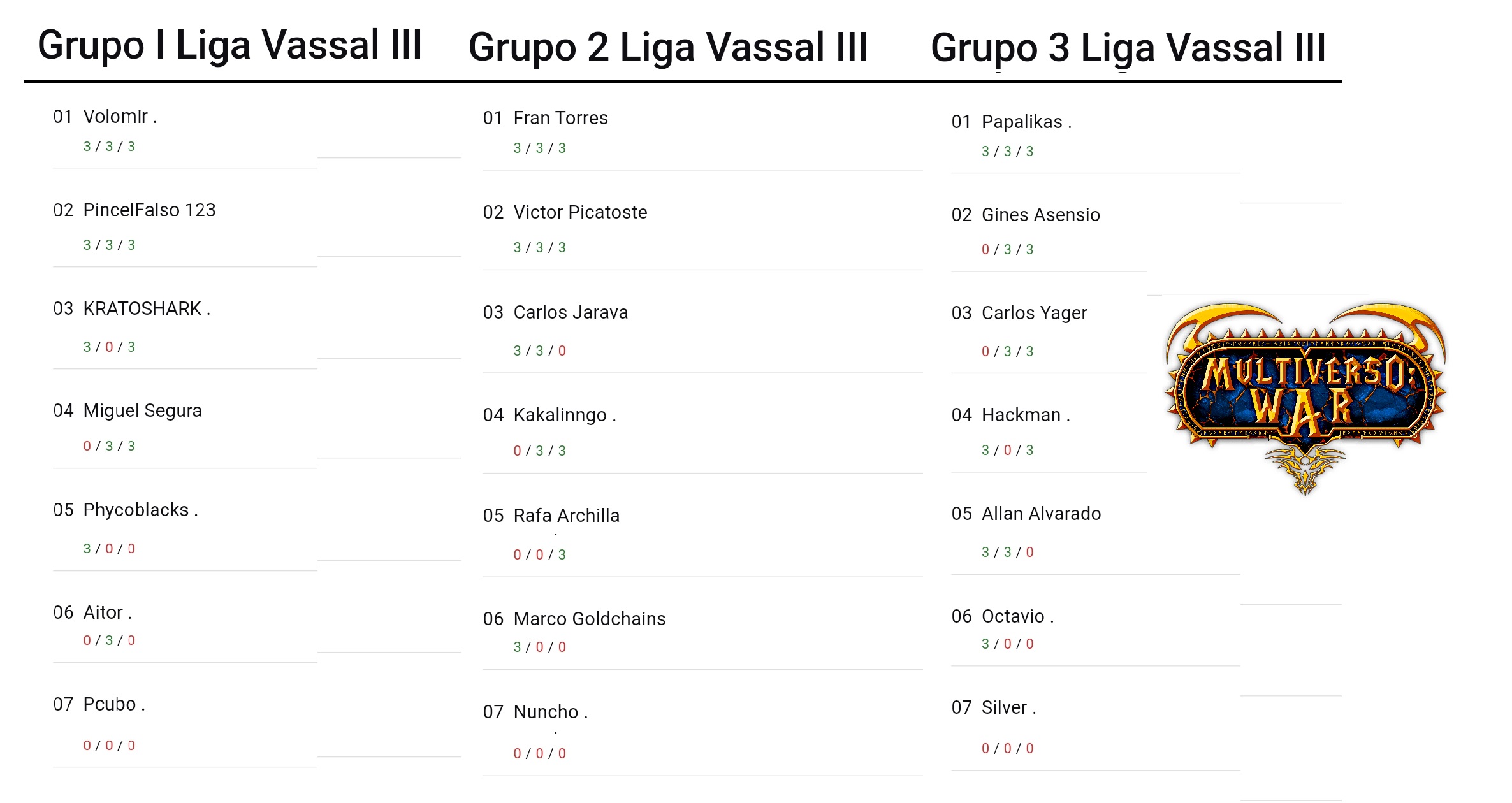 Ya empezamos a tener algunos candidatos a clasificarse a los play-offs de octavos (se clasifican los dos primeros de cada grupo y los dos mejores terceros). Volomir y PincelFalso comandan el grupo 1 sin conceder ni una derrota por ahora. En el grupo 2 pasa lo mismo con Fran Torres y Víctor picatoste, viejos contrincantes en la final de la anterior liga y que vuelven a verse las caras en ésta. Por su parte, el grupo 3 es el más reñido por el momento, ya que todos los jugadores han perdido alguna partida, salvo Papalikas que manda con puño de hierro. Quedan cuatro jornadas y todavía puede pasar de todo, que nadie se confíe.