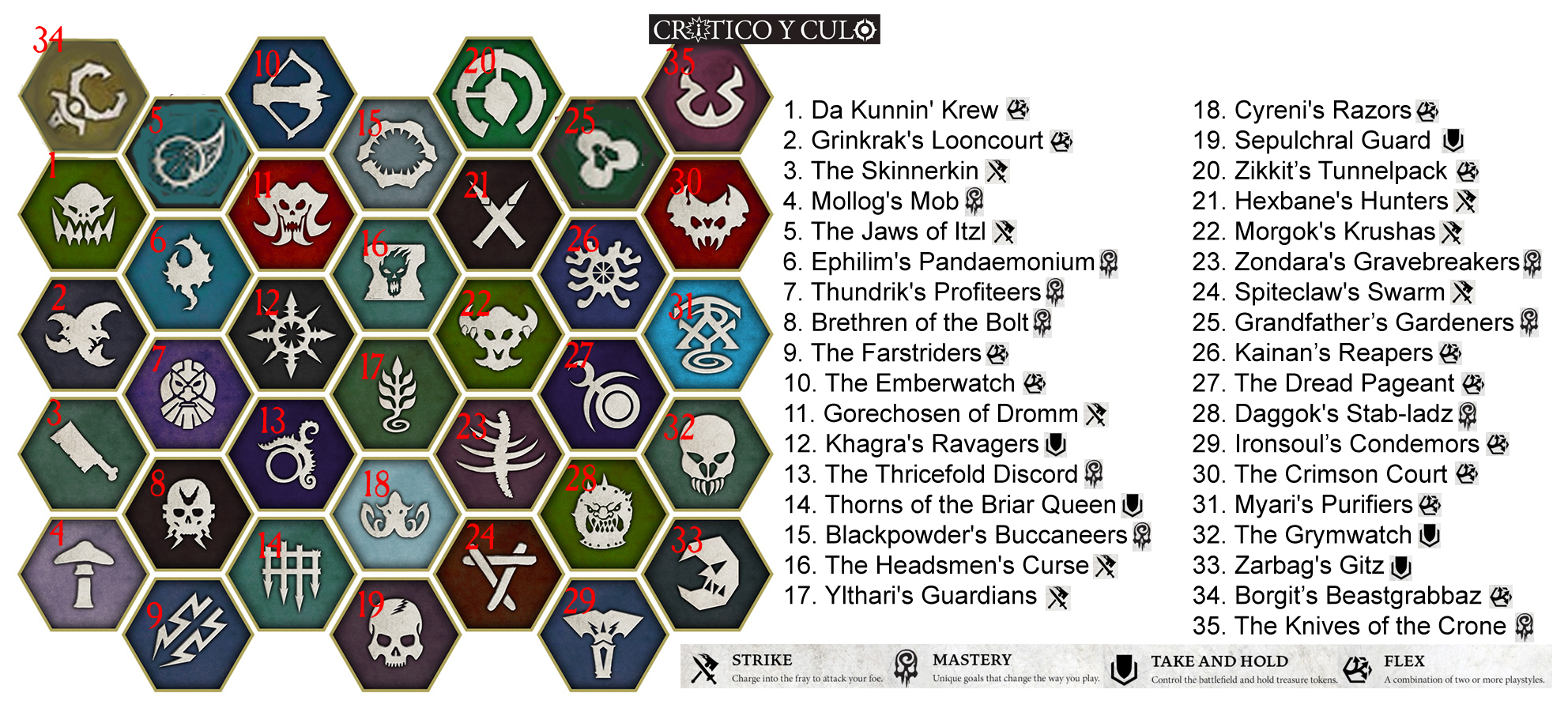 - Resto de bandas: el resto de bandas están fuera de las permitidas en torneos oficiales. Esto no quiere decir que no puedas jugar con ellas. TODAS las bandas del juego que no son legales en competitivo tienen reglas GRATUITAS en PDF para jugar con ellas. Consulta nuestra sección de materiales para obtener las reglas. Además, está confirmado que varias de estas bandas entrarán en la rotación competitiva en el futuro. Por otro lado, los torneos de tienda de tu localidad es posible que permitan jugar estas bandas. Pregúntalo.
