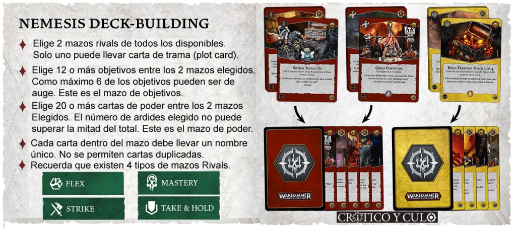 Por su parte, el formato competitivo oficial de la 2ª edición de Warhammer Underworlds es Némesis. A la hora de construir el mazo de jugador (objetivos y poder), tiene las siguientes particularidades.