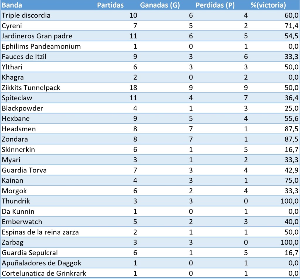 - Se han usado 25 de las 33 bandas disponibles en juego competitivo. Lo cual demuestra las ganas de probar bandas distintas. El formato liga online es perfecto para probar cositas, como queda demostrado aquí.