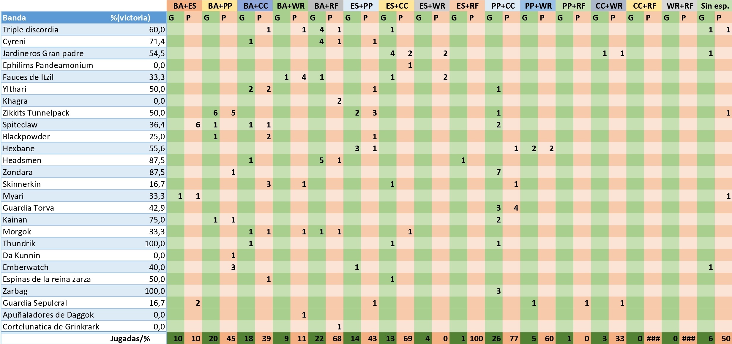 La última fila incluye en verde fuerte el número de partidas que se ha usado la combinación (por parte de todas las bandas) y en rosa fuerte el % de victoria de dicha combinación. Aspectos a destacar: