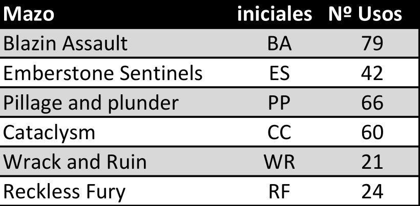 Usando la nomenclatura de la tabla anterior, pasamos ahora a analizar el uso de las combinaciones de mazos y el aprovechamiento que hace cada banda de estas combinaciones. En esta tabla podrás ver qué combinaciones se están usando en tu banda favorita y con qué éxito. Abre la imagen en grande pinchando en ella para ver todos los detalles.