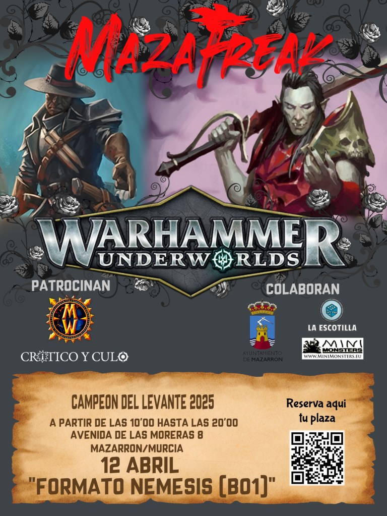 • El sábado 12 de abril tendrá lugar, como en los últimos años, en Mazarrón el evento friki de las MazaFreaks 3.0. Y como va siendo tradición también, en dicho evento tiene lugar un torneo de Warhammer Underworlds de primerísimo nivel. El campeón del Levante. Veamos toda la información