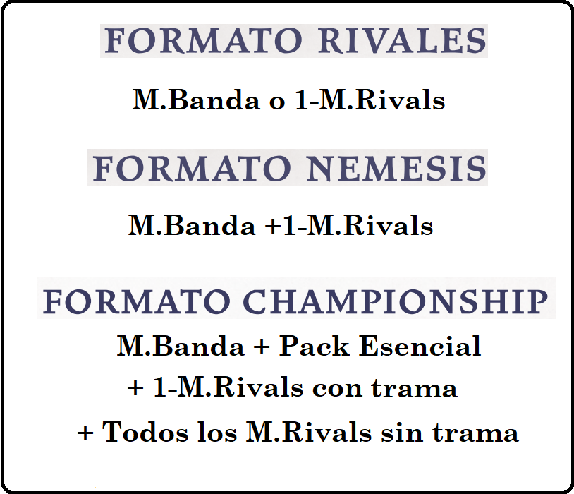 Los dos formatos principales para competir del juego son: Némesis y Championship. Si pinchas en el enlace de cada nombre, encontrarás las reglas detalladas de cada formato.