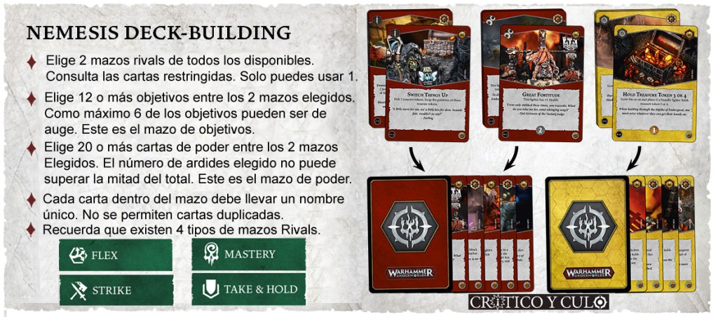El formato competitivo oficial de la 2ª edición de Warhammer Underworlds es Némesis. A la hora de construir el mazo de jugador (objetivos y poder), tiene las siguientes particularidades.